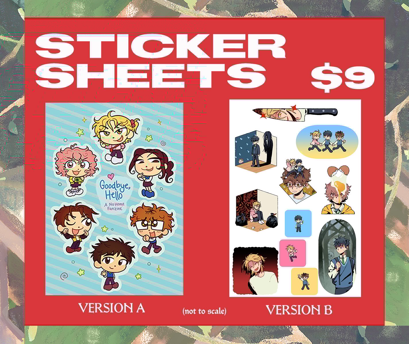 Sticker sheets, (around 5"x7" each). Version A designed by Ally (@pirinmiku), Version B designed by Sei (@seirxi). Will be shipped in a small rigid mailer if ordered on its own.